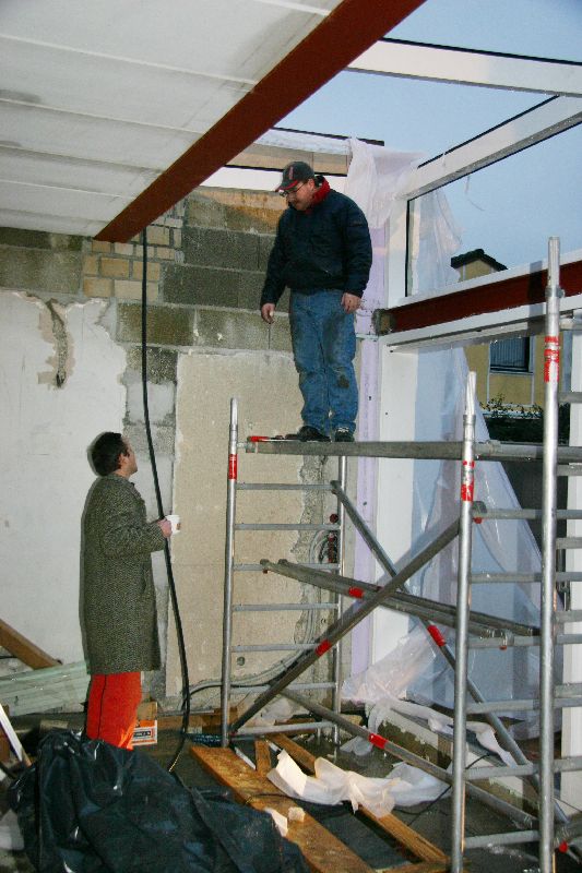 Aus sicherer Entfernung beichtet uns der Schlosser: "Ähh, ach übrigens... Die Scheiben montieren wir doch nicht mehr vor Weihnachten, die kommen erst am 9. Januar!" - (Heute wissen wir: Die Doppelgläser wurden erst am 12. und 15. Januar 2006 gefertigt)