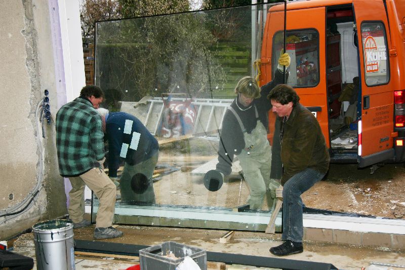 Wie versprochen verglast der Schreiner am 23. Dezember die Schiebeanlage.