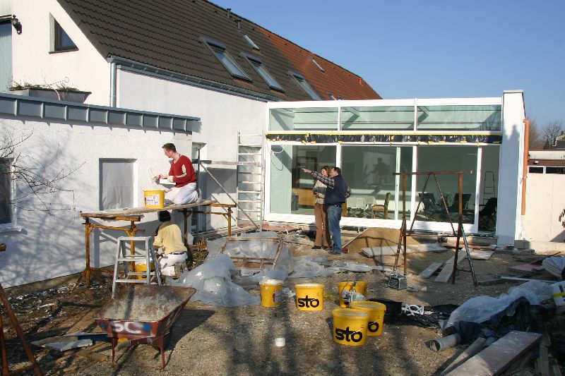 Putzer und Bauherr freuen sich nach langem Regen über den Sonnenschein