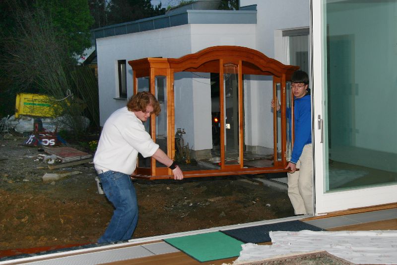 Kräftige Jungs tragen den Schrank ins Wohnzimmer