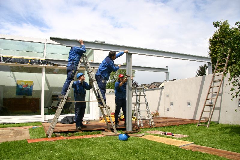 Das Schlosser-Team montiert die Tragschienen für das fahrbare Terrassendach