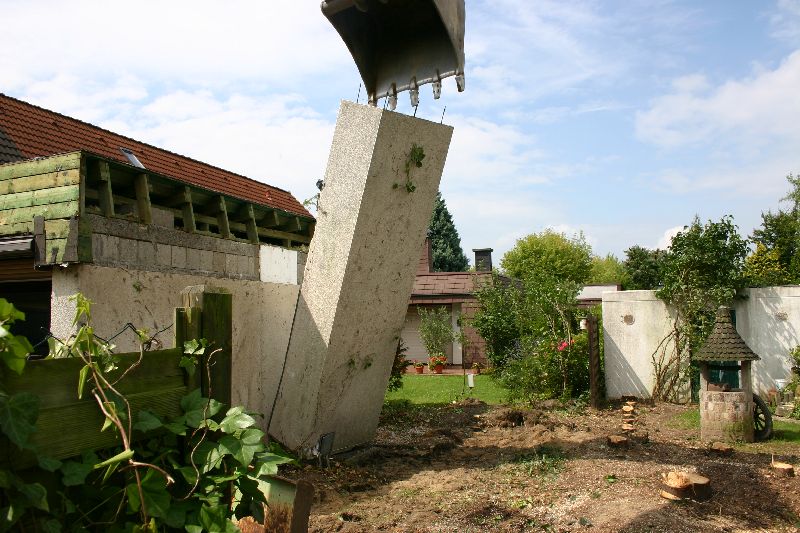 Der Baggerführer knabbert mit dem "kleinen Finger" den Kamin an, ...