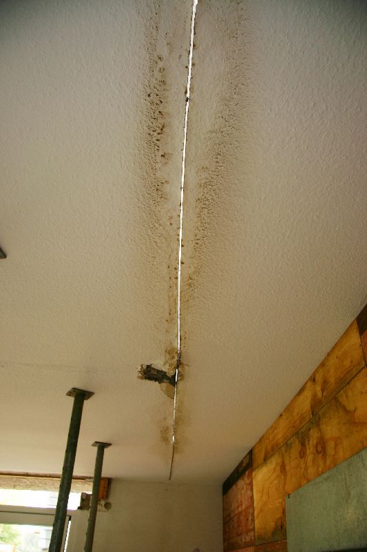Ein 6mm breiter Spalt trennt unser Haus von der zum Abbruch vorgesehenden Wohnzimmerdecke. (Aufgrund der in der Decke verlaufenden Muniereisen leicht gekrümmt.)